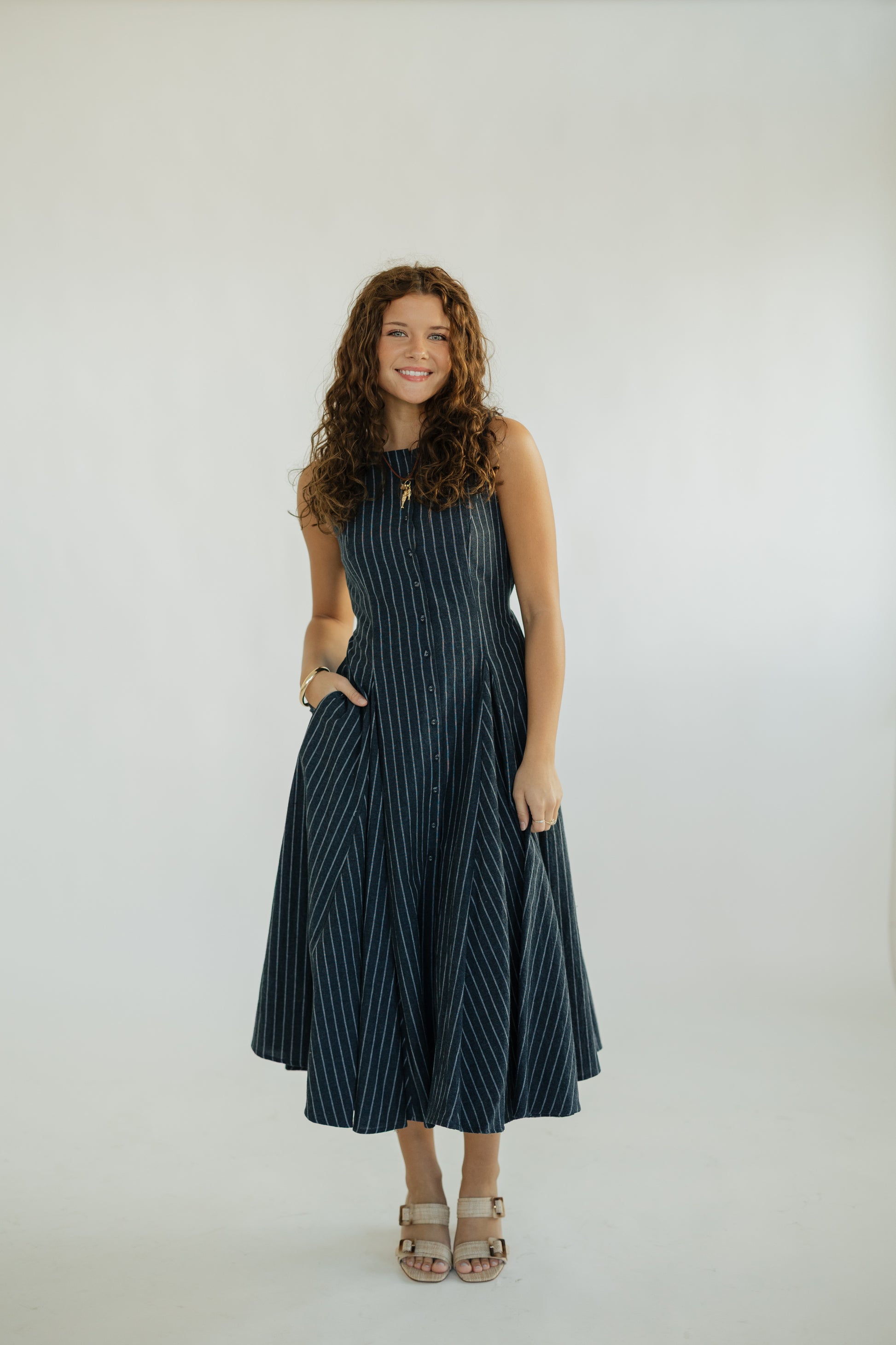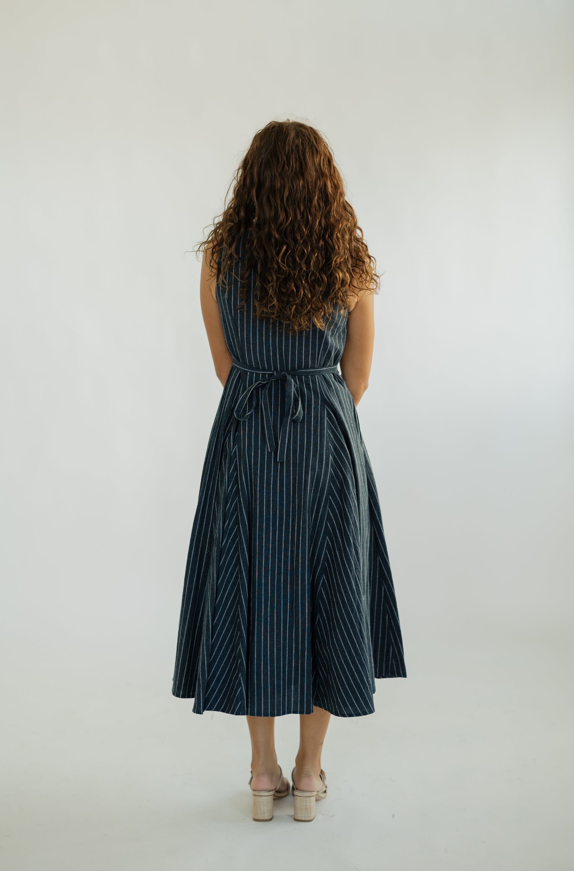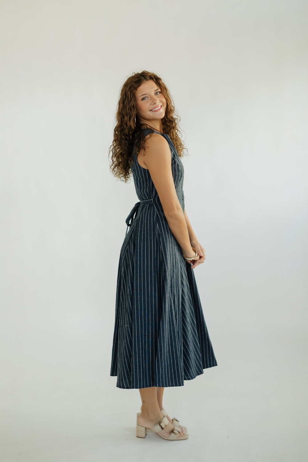 Breezy, timeless, and effortlessly chic, the Navy Linen Striped Midi Dress is a warm-weather wardrobe essential. Crafted from lightweight, breathable linen, it drapes beautifully for a relaxed, flattering fit. The classic navy base with subtle stripes adds understated elegance, while the midi length creates a polished, versatile silhouette. Perfect for casual outings, brunches, or summer events, this dress pairs beautifully with sandals, espadrilles, or heels