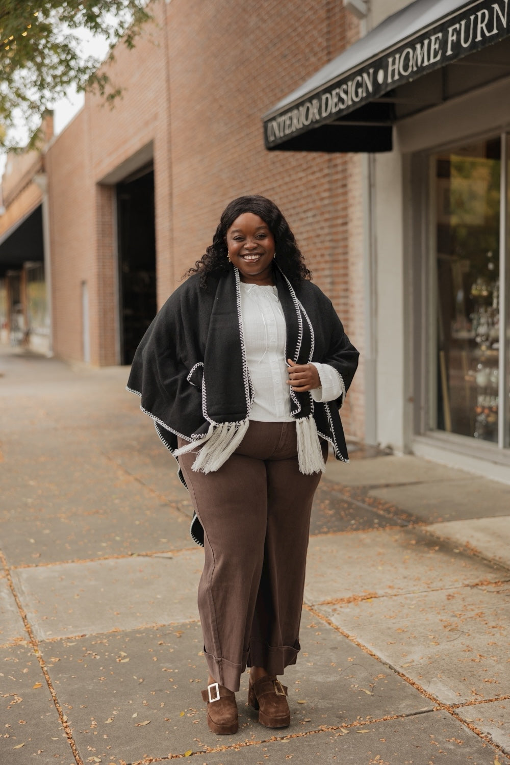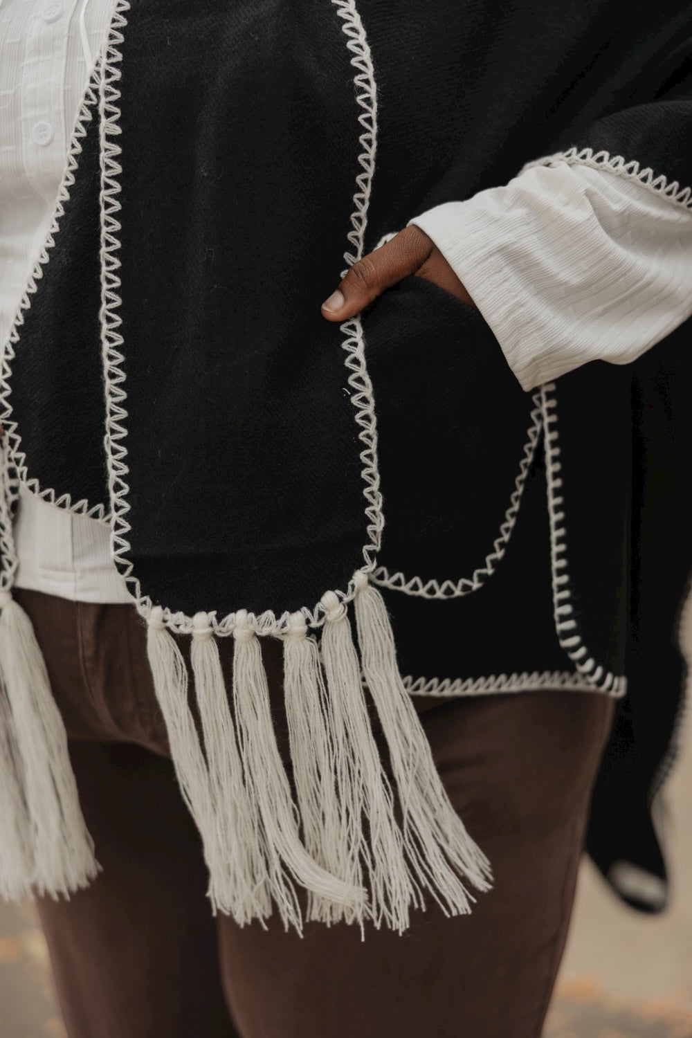 Classic, cozy, and endlessly versatile — our Black Whipstitch Wrap with Scarf is the ultimate layering essential for effortless style and comfort. Crafted from a luxuriously soft woven fabric in a timeless black hue, this wrap offers a perfect balance of warmth and lightness. The matching scarf adds an extra touch of versatility, allowing you to style it multiple ways for any occasion.