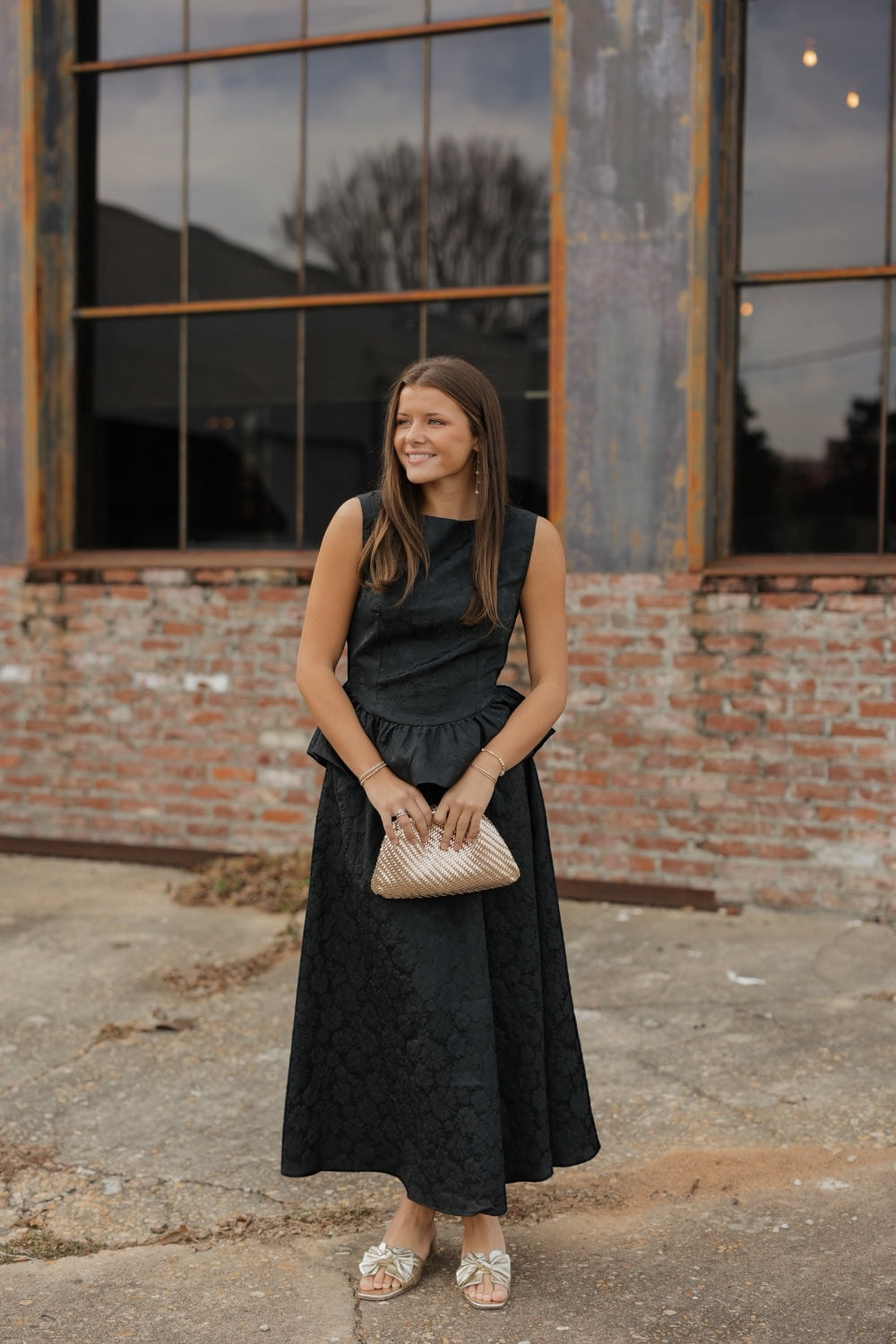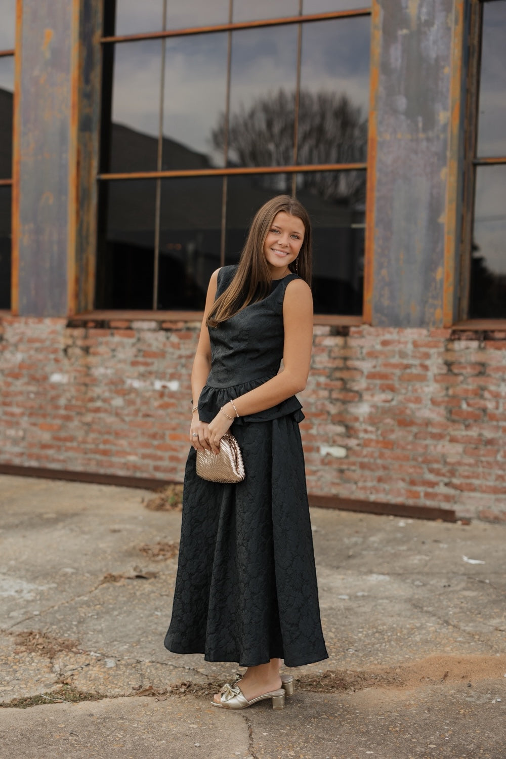 Embrace timeless sophistication with the Bronte Black Brocade Midi Skirt, a beautifully crafted piece designed to bring elegance and depth to any wardrobe. Made from luxe black brocade fabric, this skirt features an intricate woven pattern that adds rich texture and a subtle sheen—perfect for making a refined statement.
