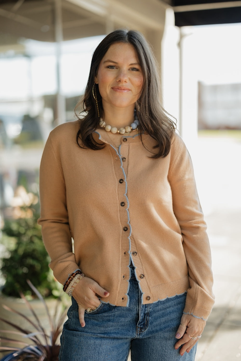 Sweet with a touch of sophistication, the Helen Blue Scallop Hem Cardigan brings a charming twist to a classic layering piece. Designed in a soft, sky-blue knit, this cardigan features a delicate scalloped hem and cuffs for a subtle yet eye-catching detail. The lightweight fabric and flattering fit make it perfect for year-round wear.