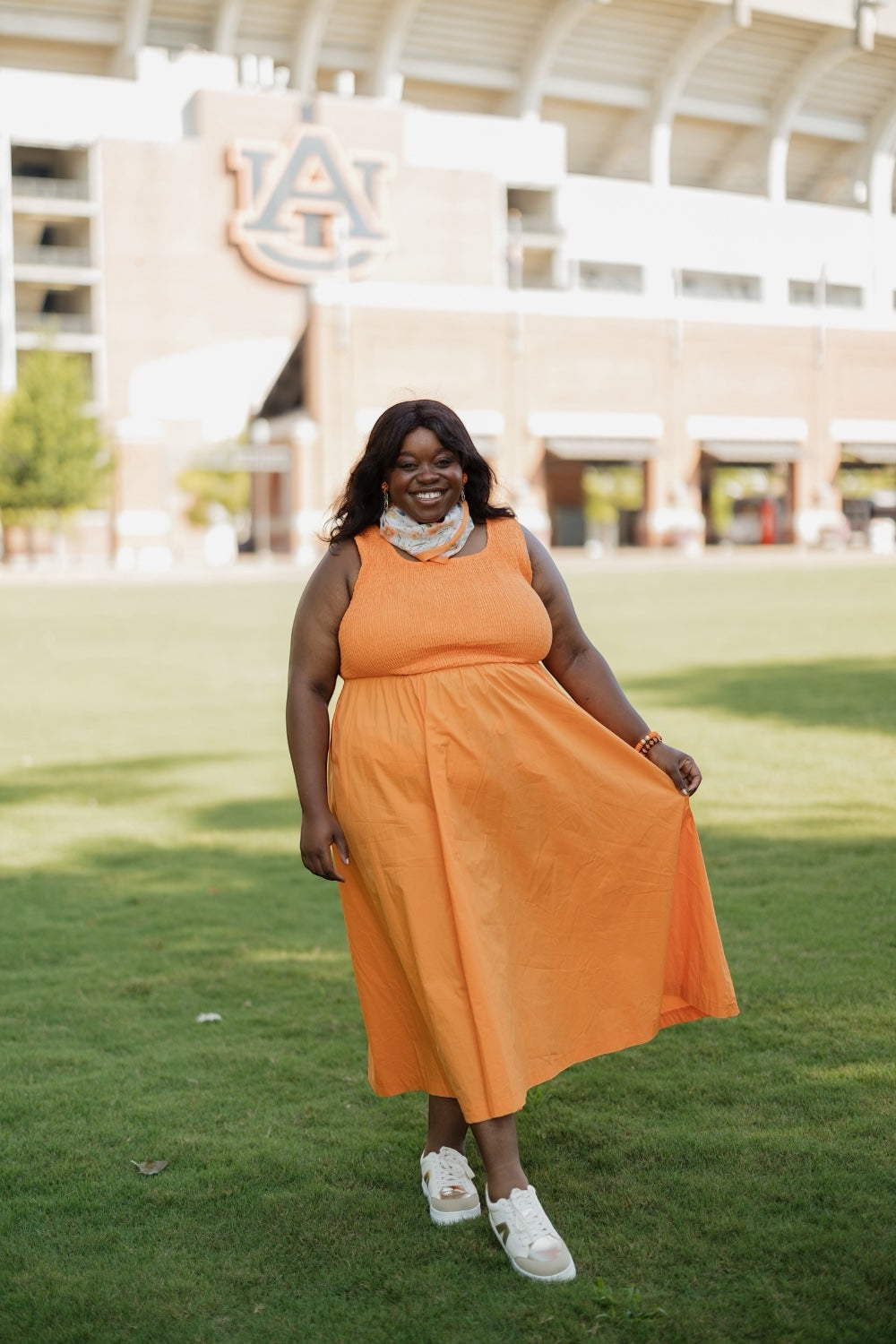 Brinley Orange Smocked Top Midi Dress