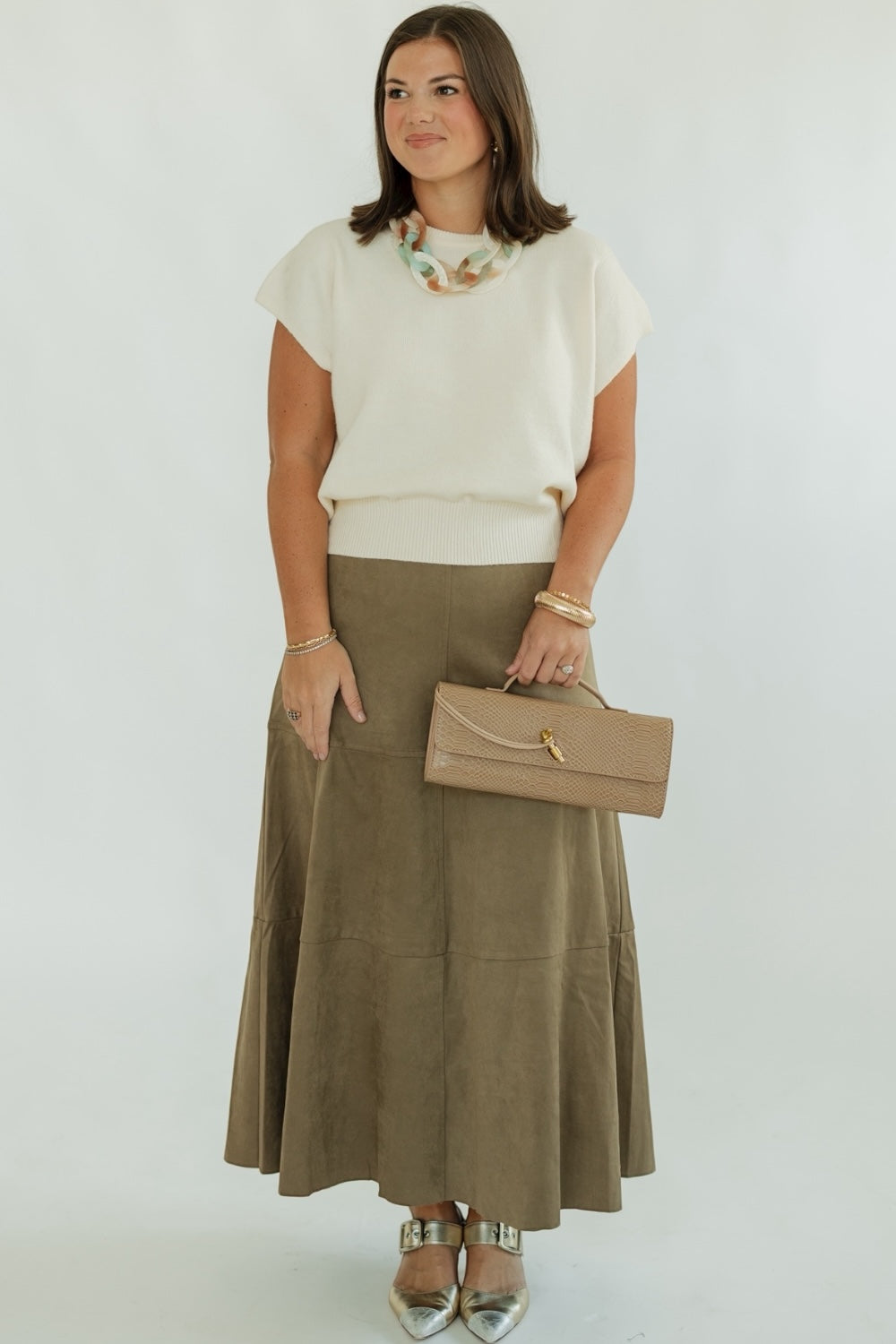 Classic meets contemporary in the Abbigail Mocha Suede A-Line Skirt, a wardrobe staple that effortlessly blends soft texture with flattering structure. Crafted from smooth faux suede in a rich mocha hue, this skirt offers a luxe feel with everyday wearability.