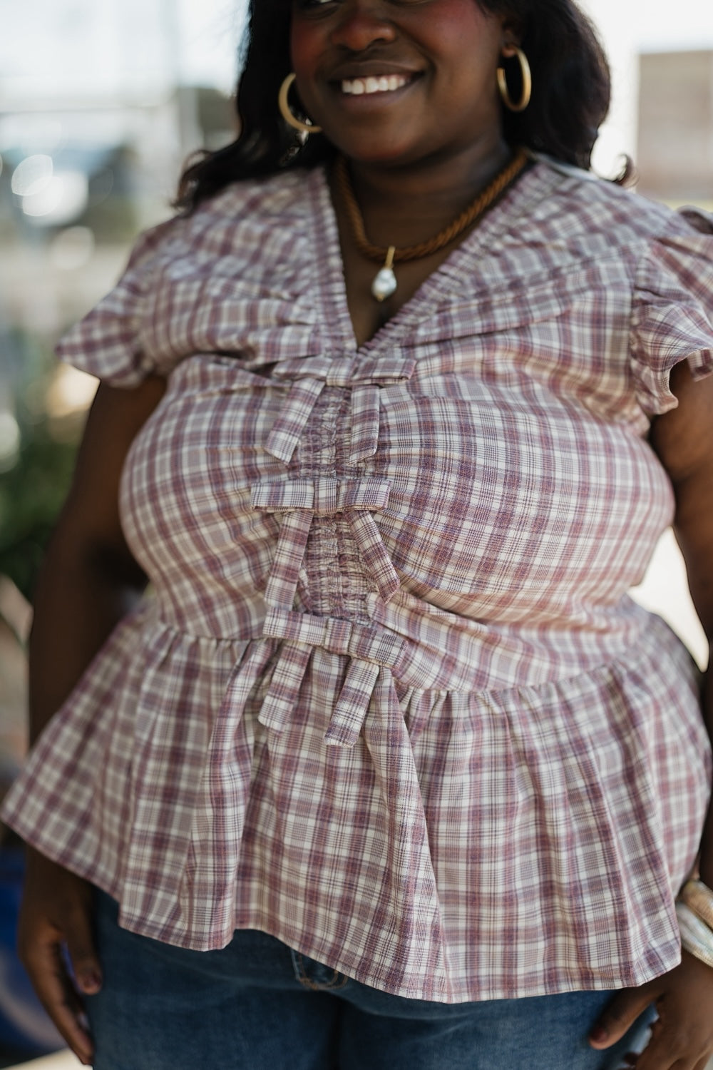 Romantic details meet everyday charm in the Misty Mauve Ruffle Plaid Blouse. Featuring a soft mauve-toned plaid and delicate ruffle accents, this lightweight blouse adds a feminine twist to a timeless print. With its relaxed fit and subtle texture, Misty is perfect for dressing up denim or layering under your favorite jacket.