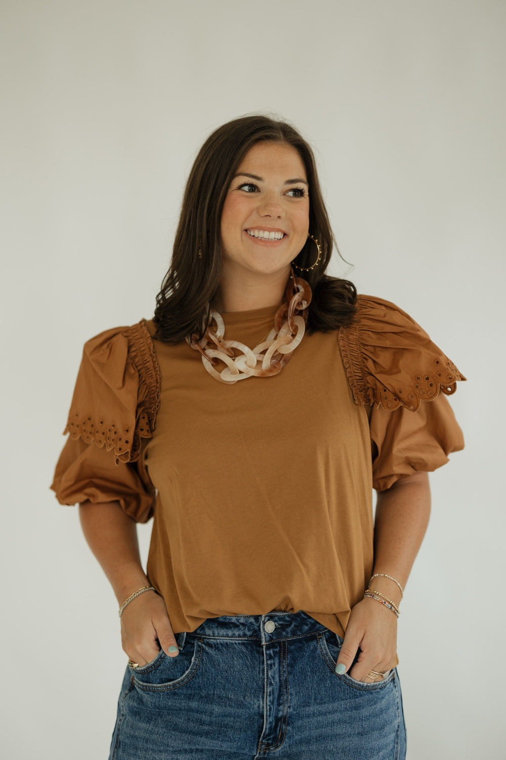 Refined yet playful, the Carol Camel Kit Top brings effortless charm to your wardrobe. Made from crisp, breathable poplin, this top features delicate ruffle sleeves that add a feminine flourish to its clean, structured silhouette. The warm camel hue offers a timeless, neutral palette that's easy to style up or down. Whether paired with tailored trousers for work or denim for weekends, this top is your go-to for polished versatility.
