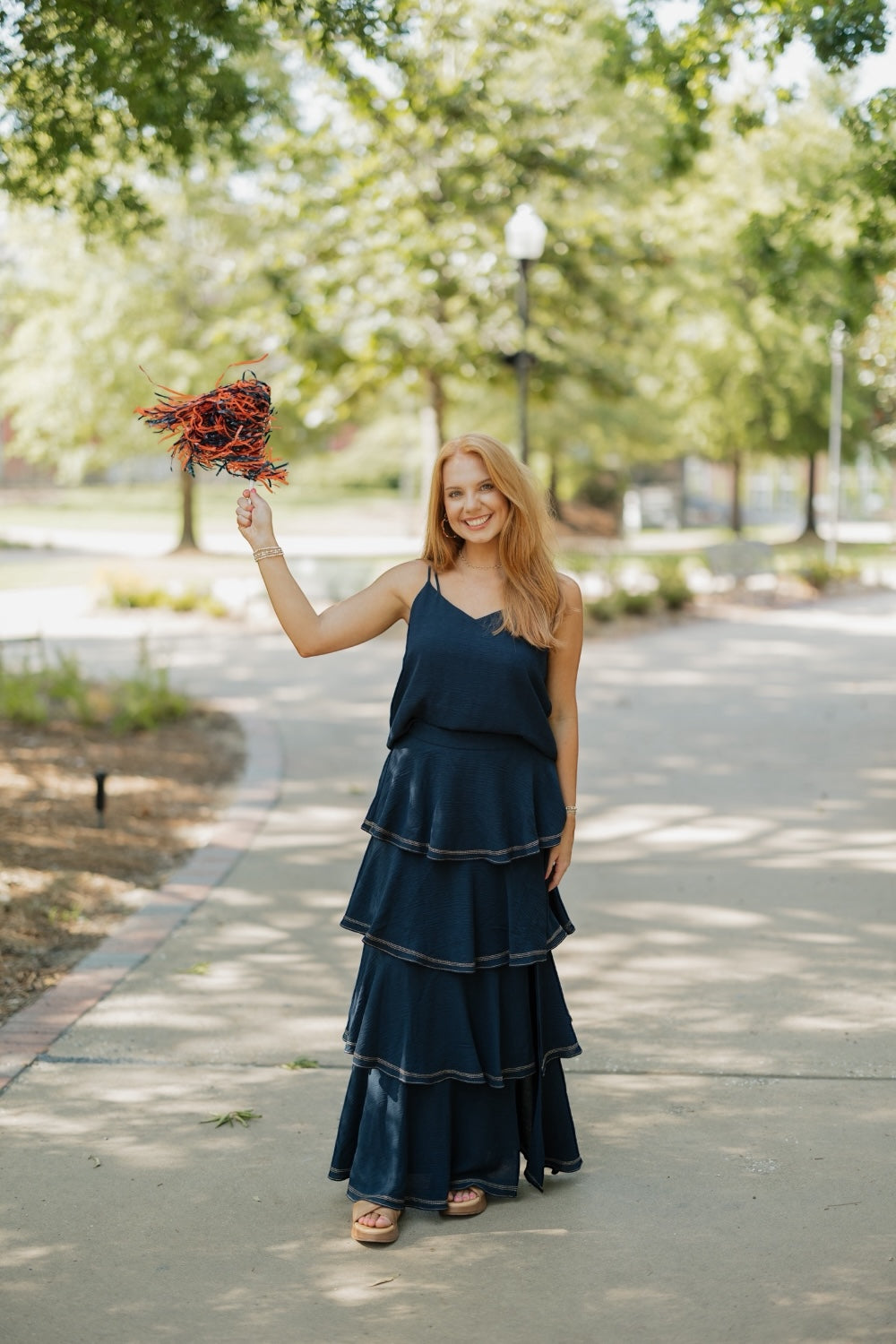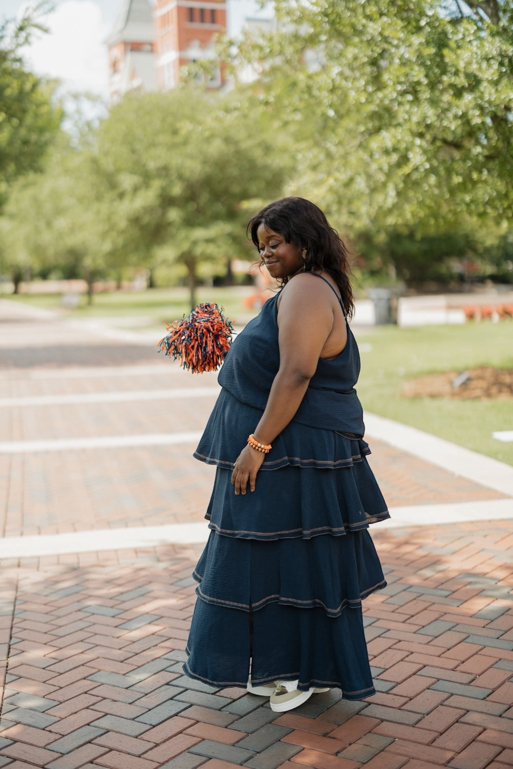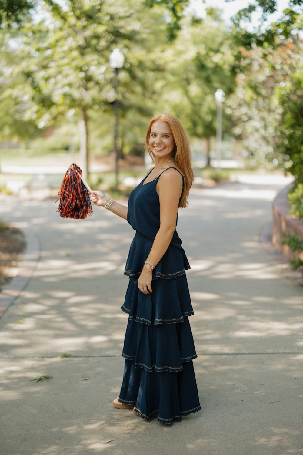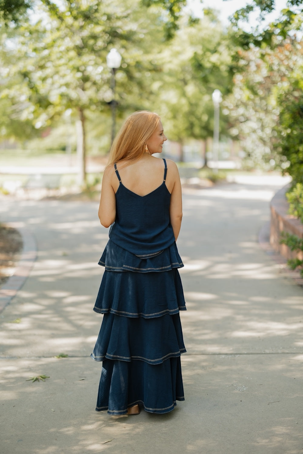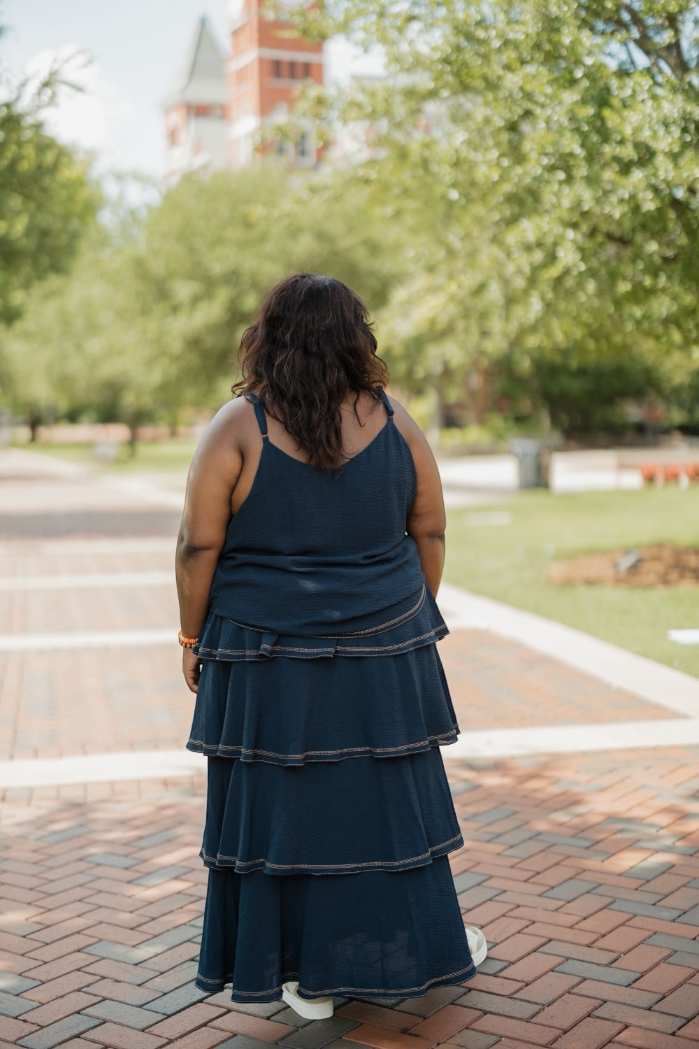 Marlee Navy Contrast Stitch Tiered Maxi Skirt (XS-3XL)
