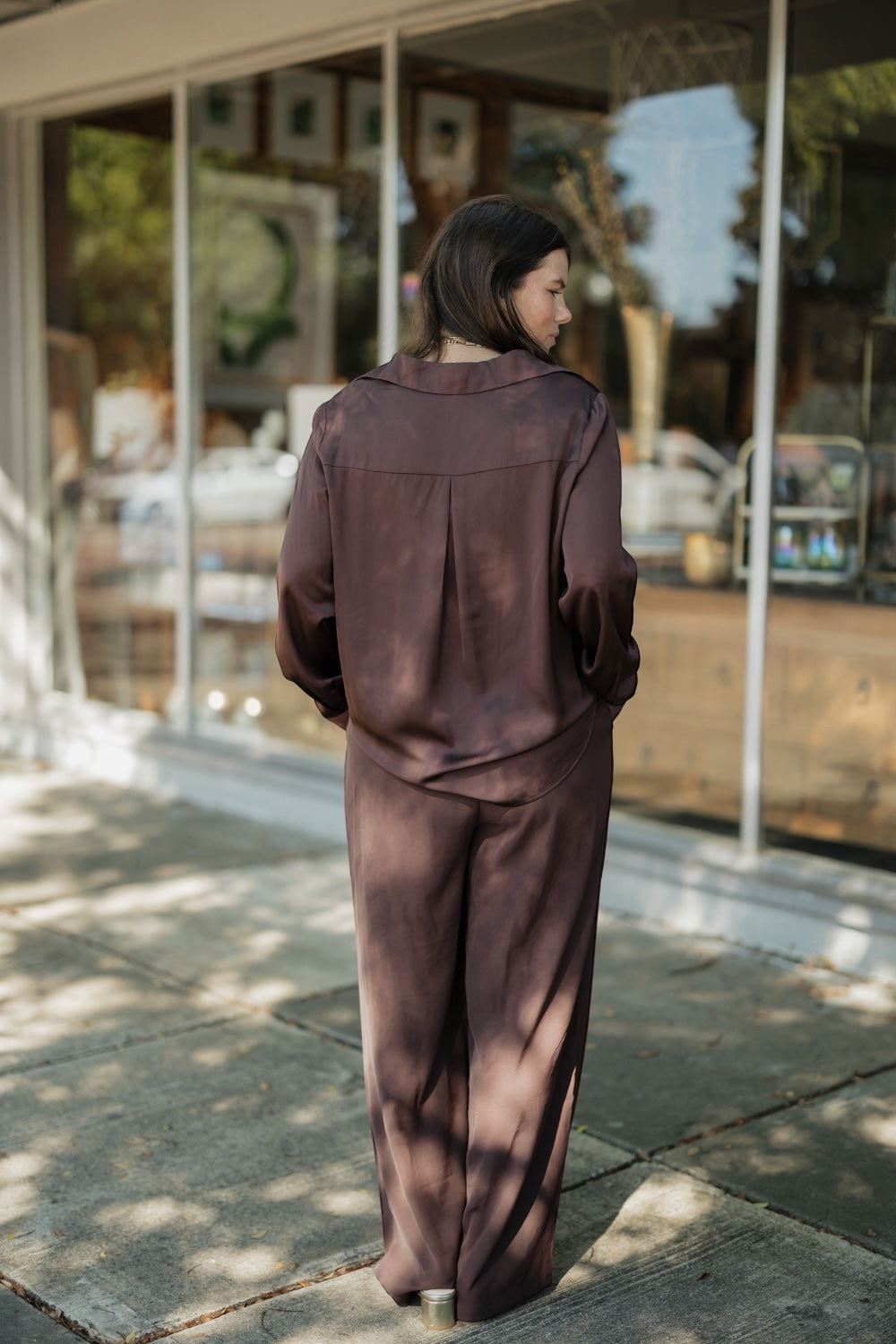 Sleek, sophisticated, and endlessly versatile — the Esther Espresso Button Down Blouse brings effortless elegance to your everyday wardrobe. Crafted from a silky, lightweight fabric in a deep espresso brown, this blouse features a classic button-down front, refined collar, and a fluid drape that flatters every silhouette.